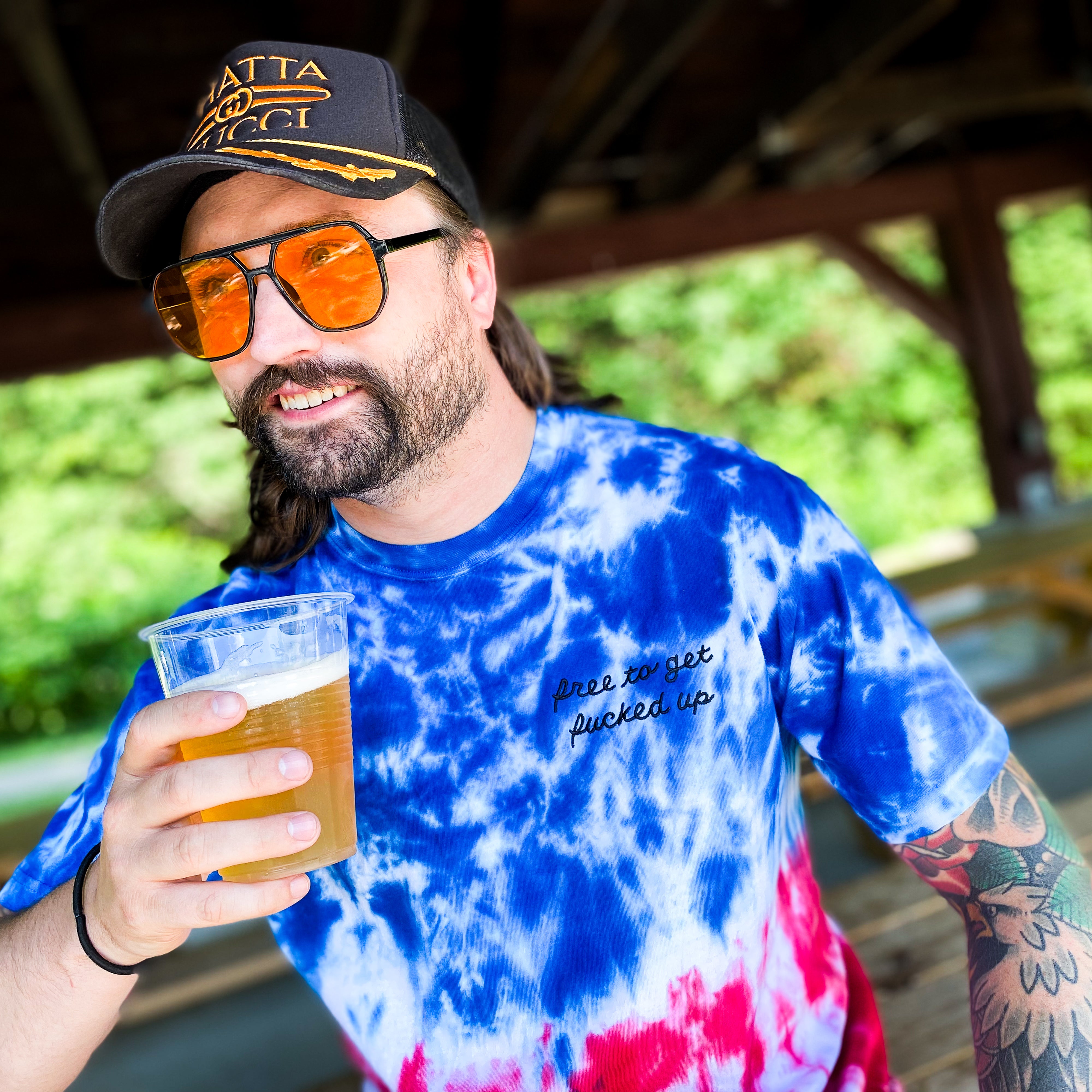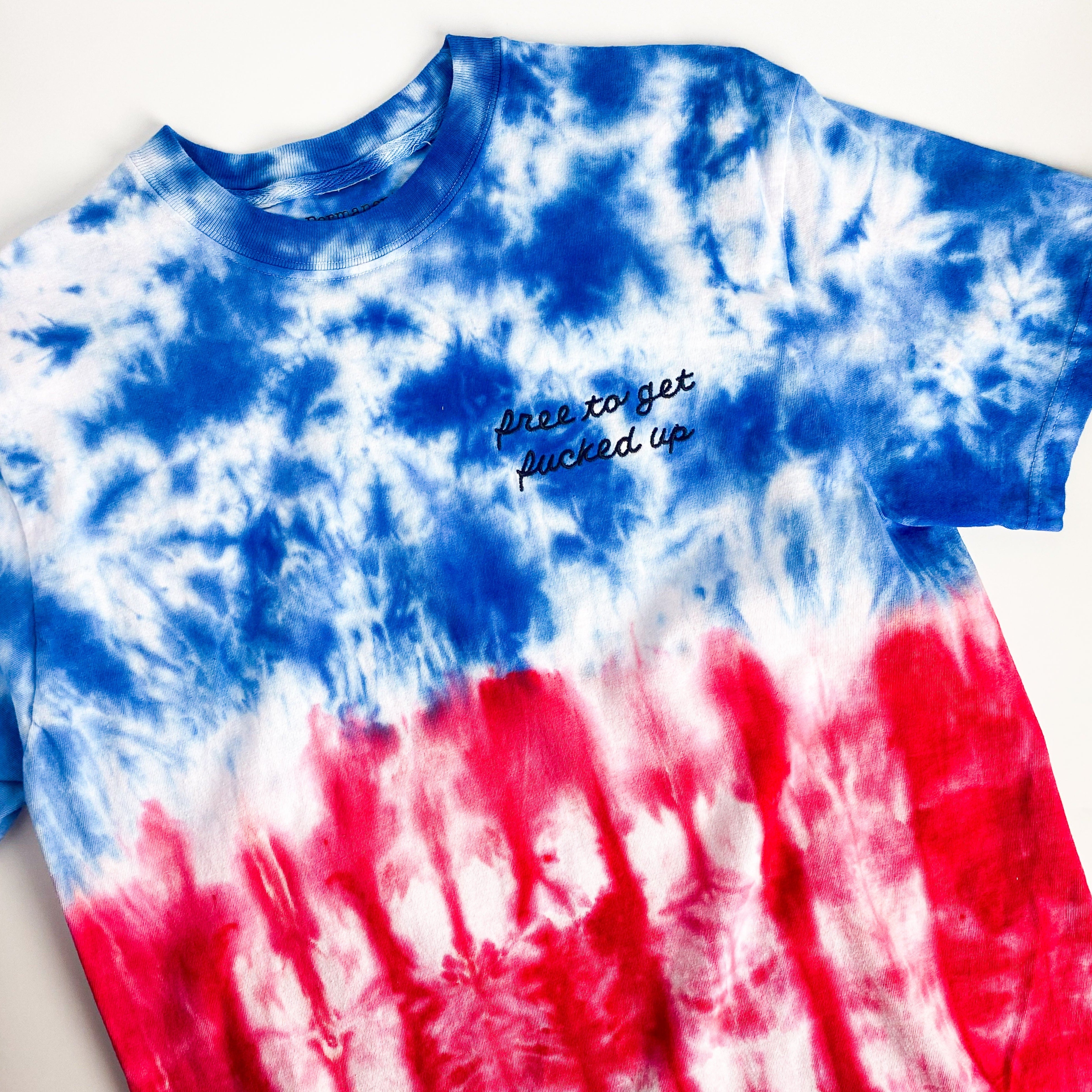 Product Specs: Unisex T, preshrunk 100% heavyweight cotton, decorated with black embroidered script on front left chest. Due to the unique nature of the tie-dye process, there will be variation across every shirt.