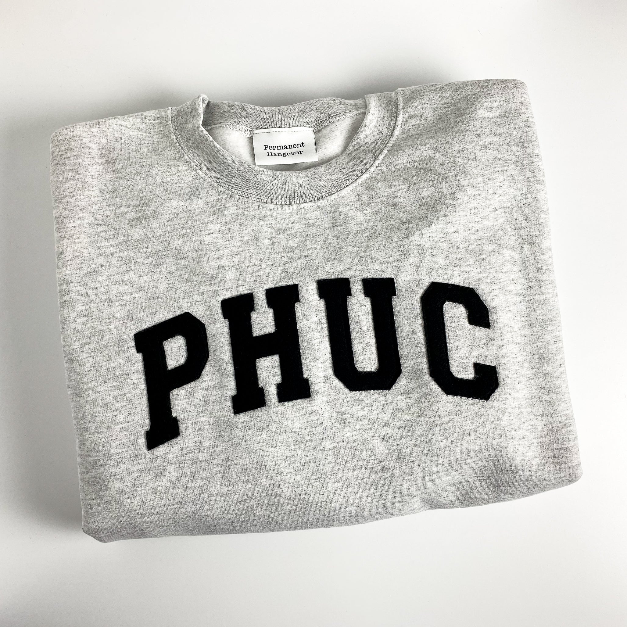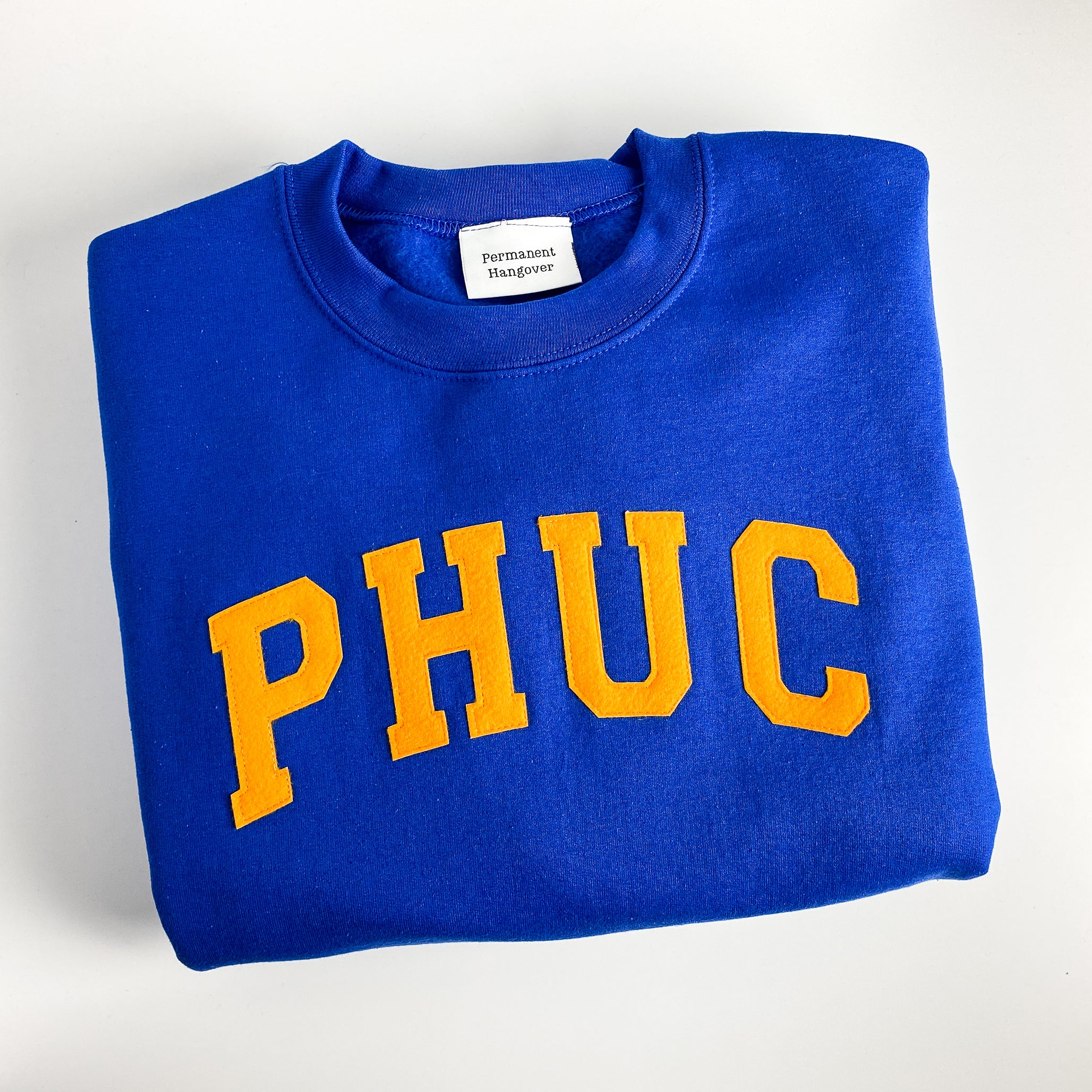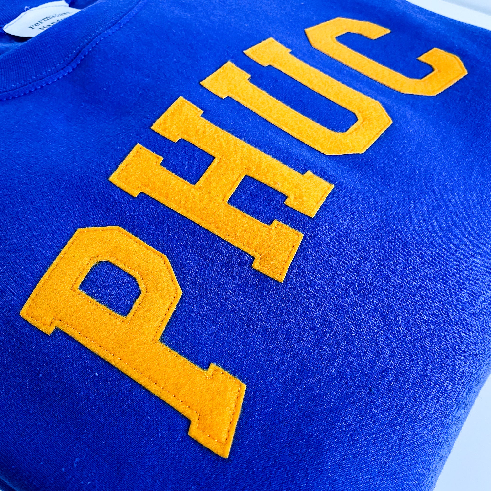 Product Specs: Unisex premium heavyweight crewneck sweatshirt, 50% Cotton / 50% Polyester. Chest decorated with felt applique. Left upper-arm decorated with woven patch university crest. All decoration is stitched on.