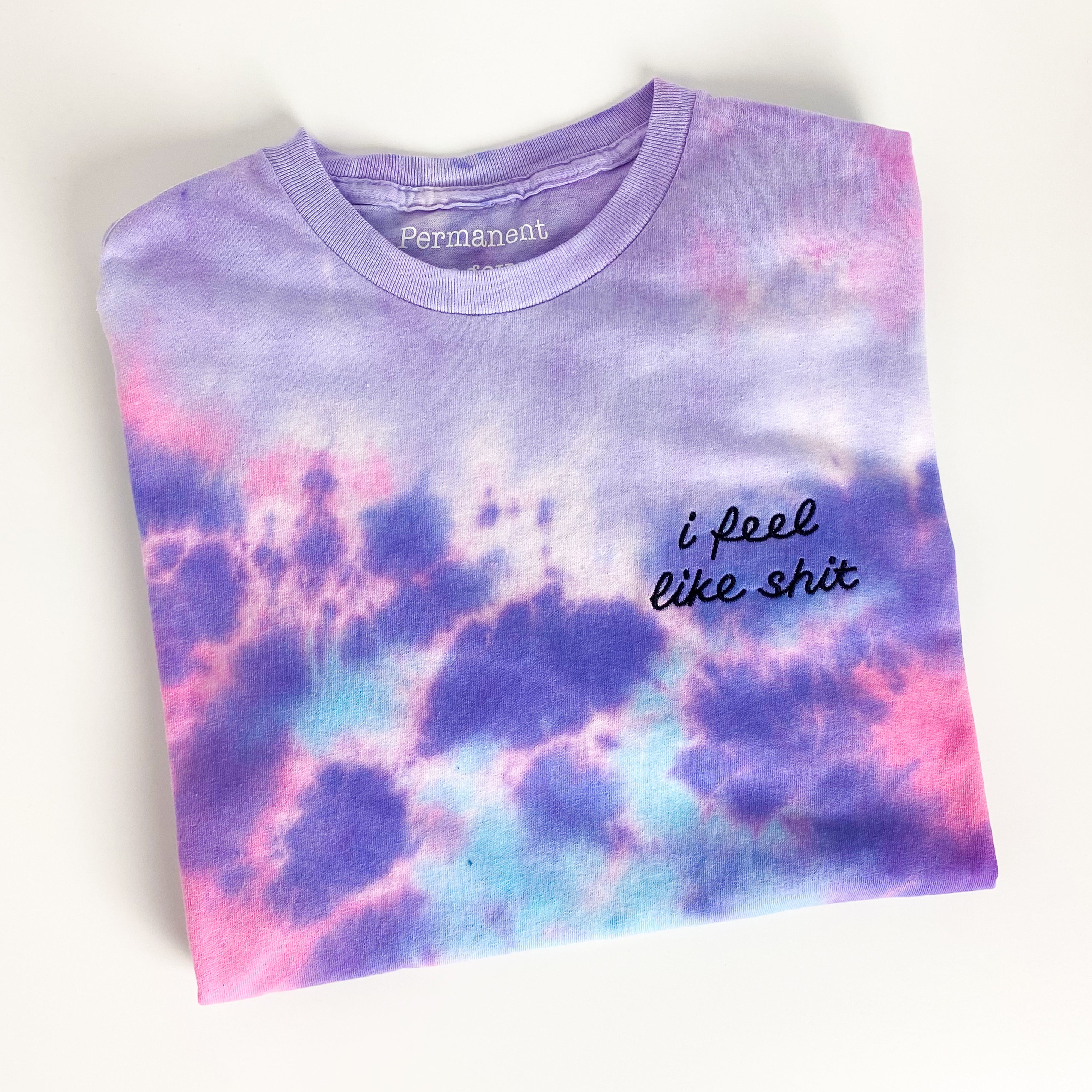 Product Specs: Unisex T, heavyweight 100% ring spun cotton, preshrunk during dying process for nearly no shrinkage at home, tie dyed and decorated with embroidered script on front left chest