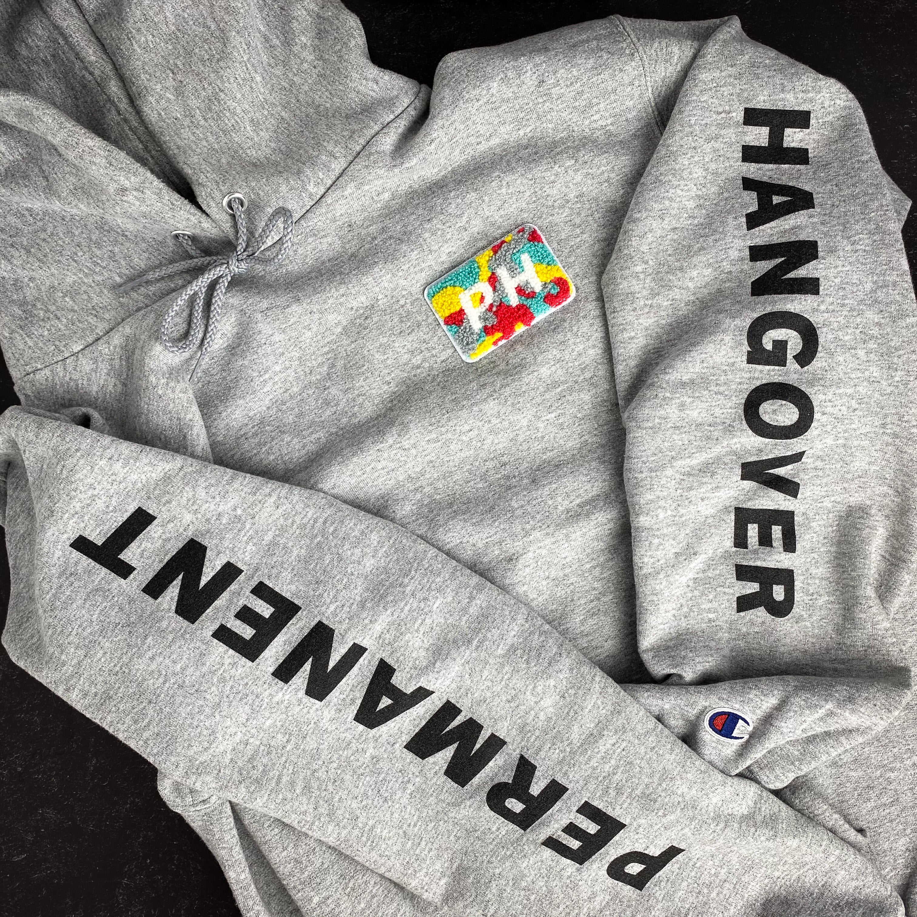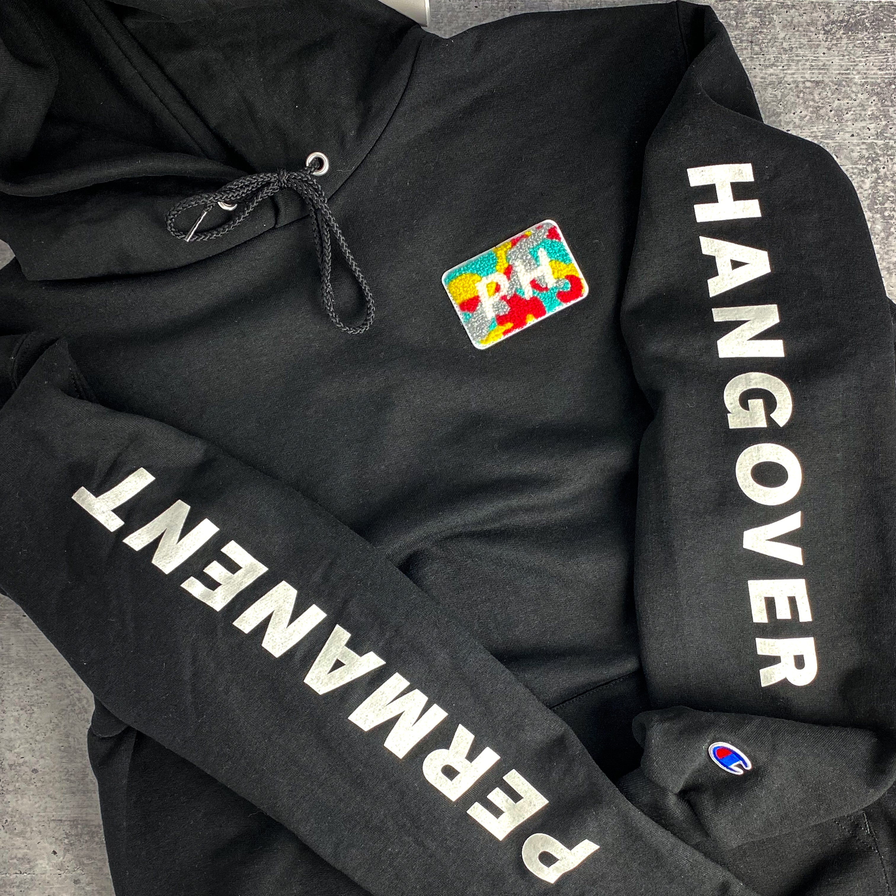 50% cotton, 50% polyester Champion® double dry eco pullover hooded sweatshirt / chenille patch on front pocket / print along sleeves / recommend hang drying to preserve quality and life of patch