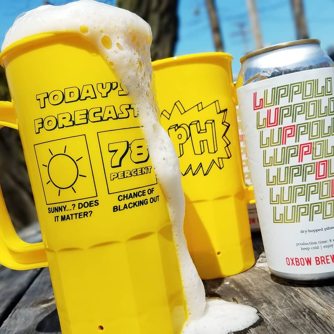 Two-sided navy print on bright yellow INDE-FUCKING-STRUCTIBLE plastic 22oz stein