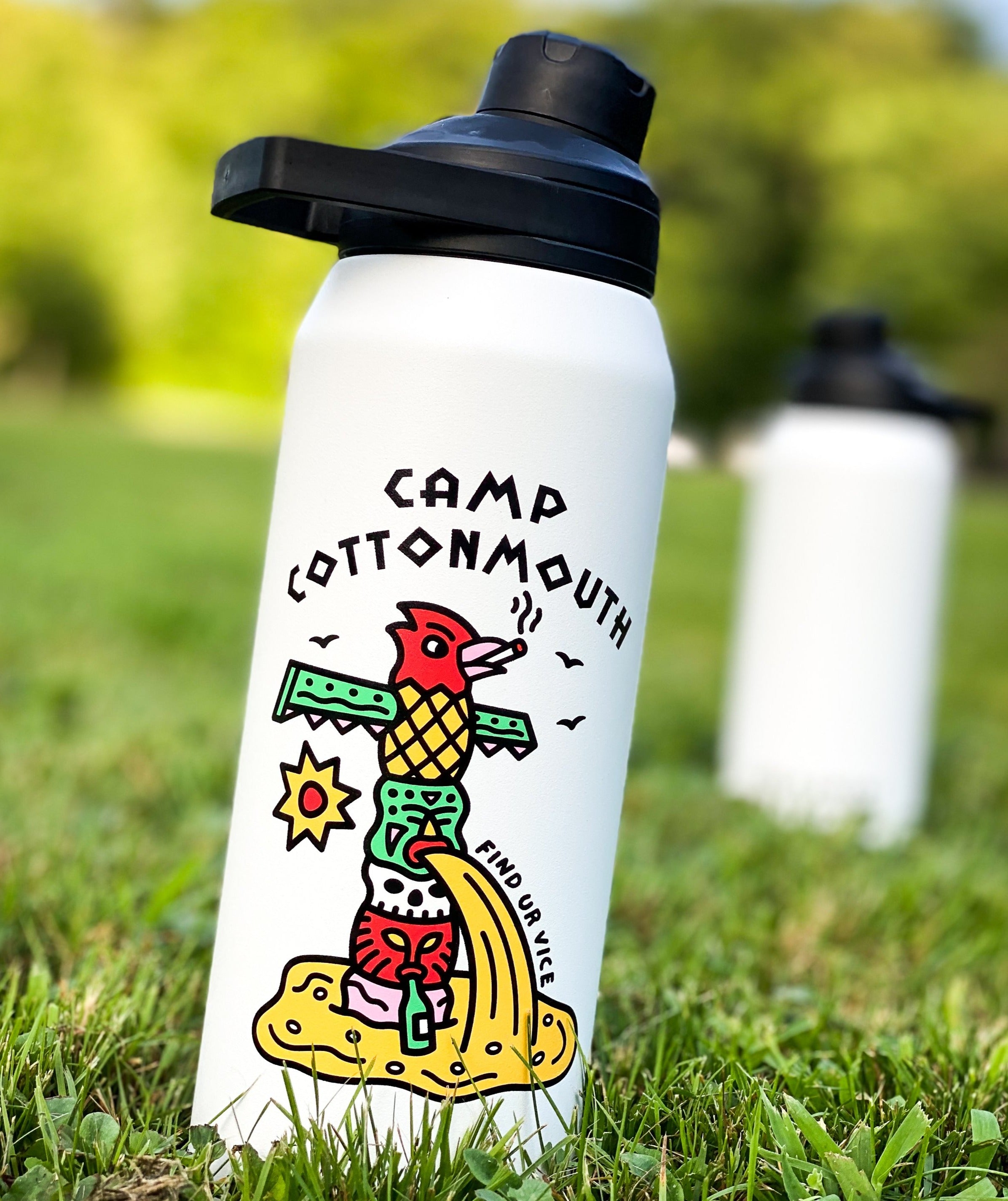 Double-wall vacuum insulated to maintain temperature for a super fuckin long time. Magnet top stows securely while u drink. Leak-proof when closed. Stays dry with sweat-proof insulation. Easy carry handle.